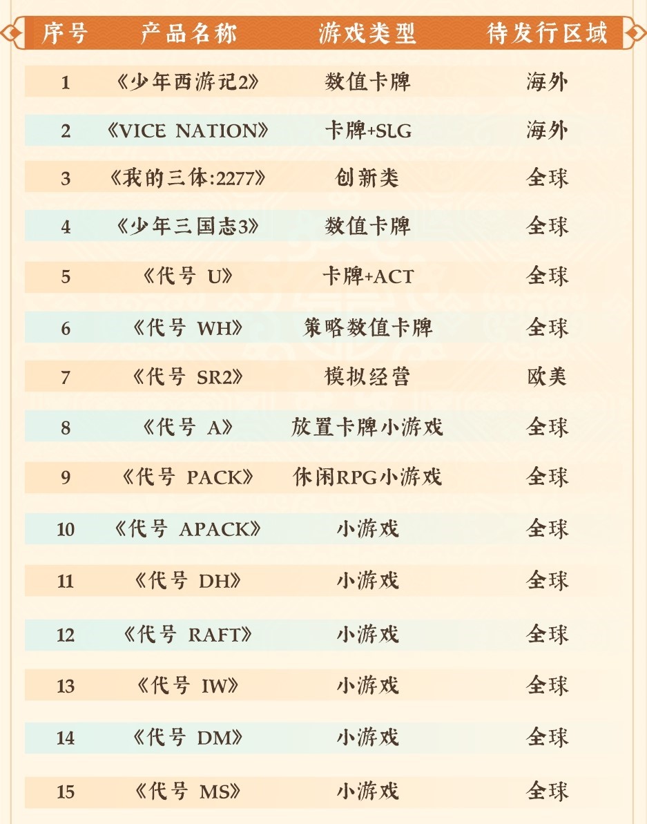 首款《三体》IP正版授权游戏《我的三体::2277》已开放预约,,另有现代都市题材SLG《Vice Nation》、、、、少年系列重磅新品《少年三国志3》、、模拟经营全平台游戏《代号::::SR2》等产品储备。。此外在小游戏赛道上,,,《代号 A》《代号 Pack》《代号 DH》等也将陆续开启测试,,,,伴随多款新品的陆续上线有望进一步撬动增长空间。。。