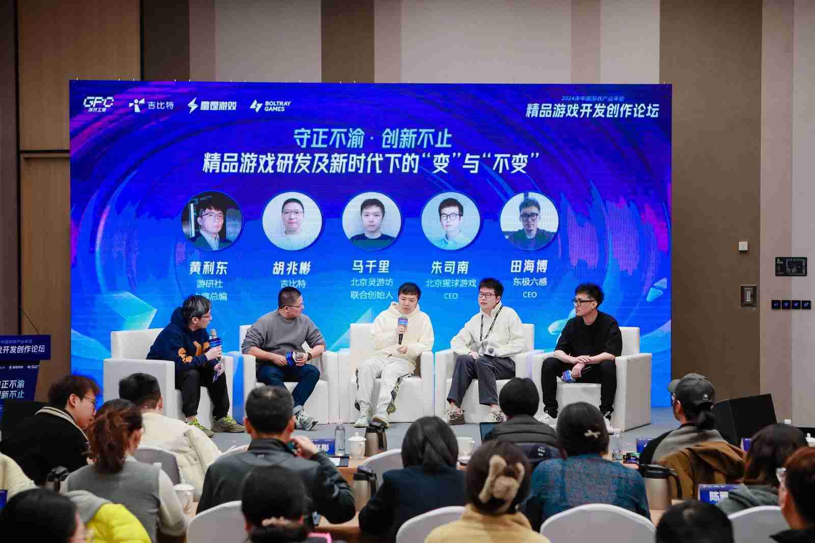 圆桌对话环节,,,在游研社内容总编黄利东的主持下,,LEWIN乐玩CTO胡兆彬、、、北京灵游坊联合创始人马千里、、北京猩球游戏CEO朱司南、、、东极六感CEO田海博等四位嘉宾围绕“守正不渝、、创新不止——精品游戏研发及新时代下的‘变’与‘不变’”这一主题分享了各自在精品游戏开发理念及工程能力搭建方面的见解和经历,,,并就行业变化下游戏人需要坚守的理念等展开交流探讨。。
